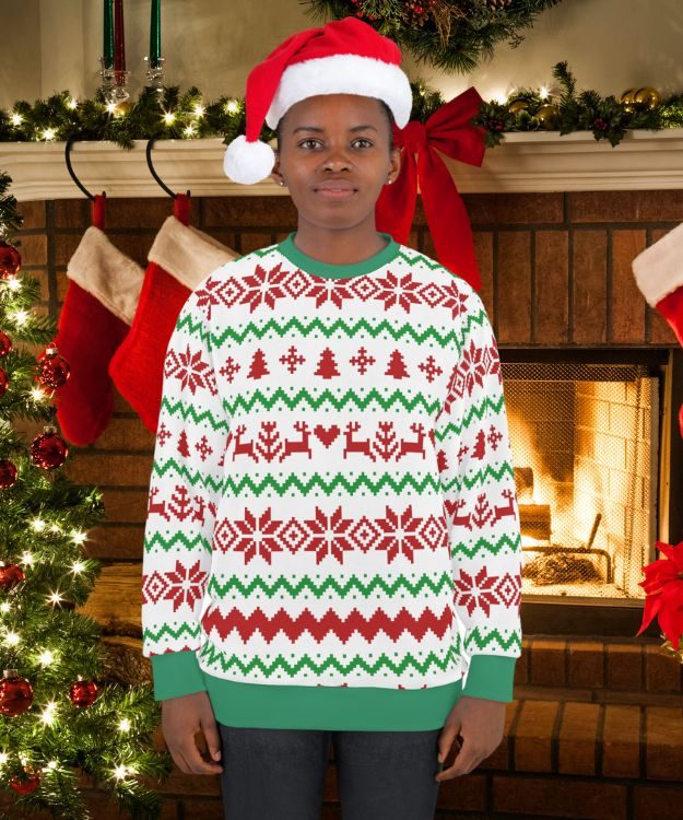 - Festive Design: Our sweatshirt showcases an eye-catching array of Christmas elements, including snowflakes, Christmas trees, reindeer, and more, in a joyful and colorful pattern that wraps around the entire garment.