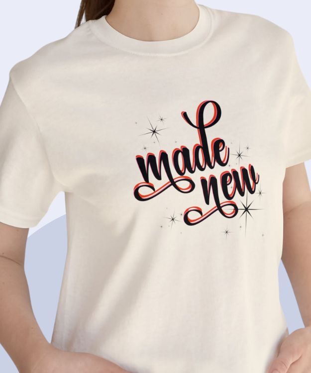 Elevate your faith and style with our ‘Made New’ Christian Inspirational T-shirt—a powerful statement of renewal and devotion for both men and women.