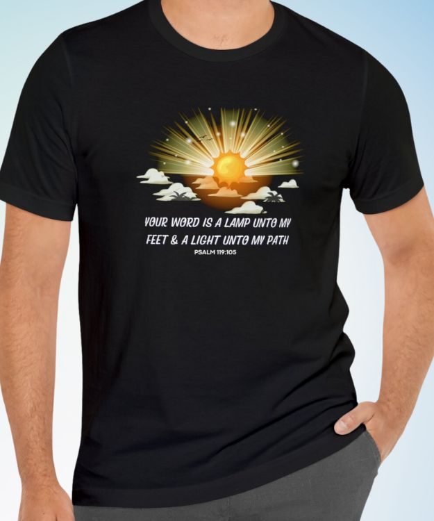 Step into a world where faith meets fashion with our ‘Your Word Is A Lamp Unto My Feet, A Light Unto My Path’ unisex tee. This inspiring design draws its inspiration from the profound message of Psalm 119:105, which declares, ‘Your word is a lamp for my feet, a light on my path.